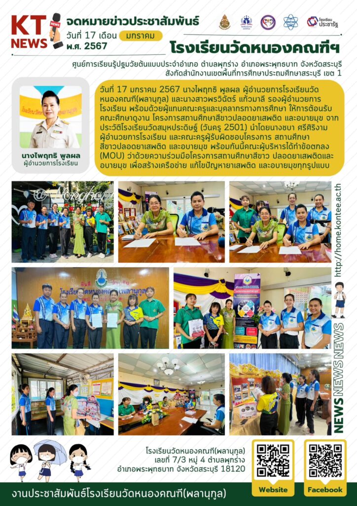 วันที่ 17 มกราคม 2567 นางไพฤทธิ พูลผล ผู้อำนวยการโรงเรียนวัดหนองคณฑี(พลานุกูล) และนางสาวพรวิฉัตร์ แก้วมาลี รองผู้อำนวยการโรงเรียน พร้อมด้วยผู้แทนคณะครูและบุคลากรทางการศึกษา ให้การต้อนรับคณะศึกษาดูงาน โครงการสถานศึกษาสีขาวปลอดยาเสพติด และอบายมุข จากประวัติโรงเรียนวัดสมุหประดิษฐ์ (วันครู 2501) นำโดยนางชบา ศรีศิริงาม ผู้อำนวยการโรงเรียน และคณะครูผู้รับผิดชอบโครงการสถานศึกษาสีขาวปลอดยาเสพติด และอบายมุข พร้อมกันนี้คณะผู้บริหารได้ทำข้อตกลง (MOU) ว่าด้วยความร่วมมือโครงการสถานศึกษาสีขาว ปลอดยาเสพติดและอบายมุข เพื่อสร้างเครือข่าย ร่วมกันแก้ไขปัญหายาเสพติด และอบายมุขทุกรูปแบบ