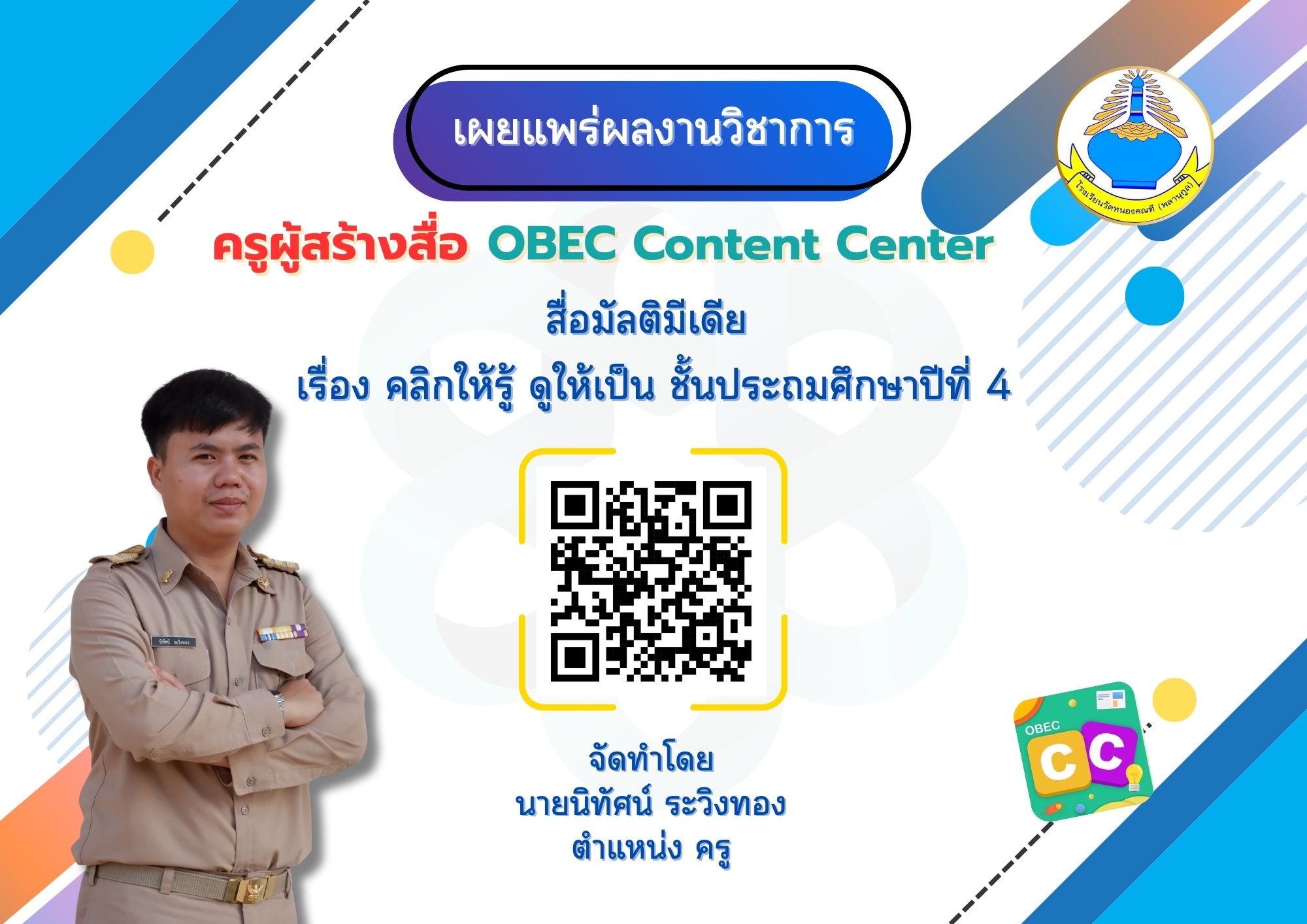 นายนิทัศน์ ระวิงทอง เผยแพร่ผลงานทางวิชาการ ตำแหน่ง ครู โรงเรียนวัดหนองคณฑี(พลานุกูล) ผู้สร้างสื่อเทคโนโลยีดิจิทัลบนระบบ OBEC Content Center เรื่อง คลิกให้รู้ ดูให้เป็น ชั้นประถมศึกษาปีที่ 4