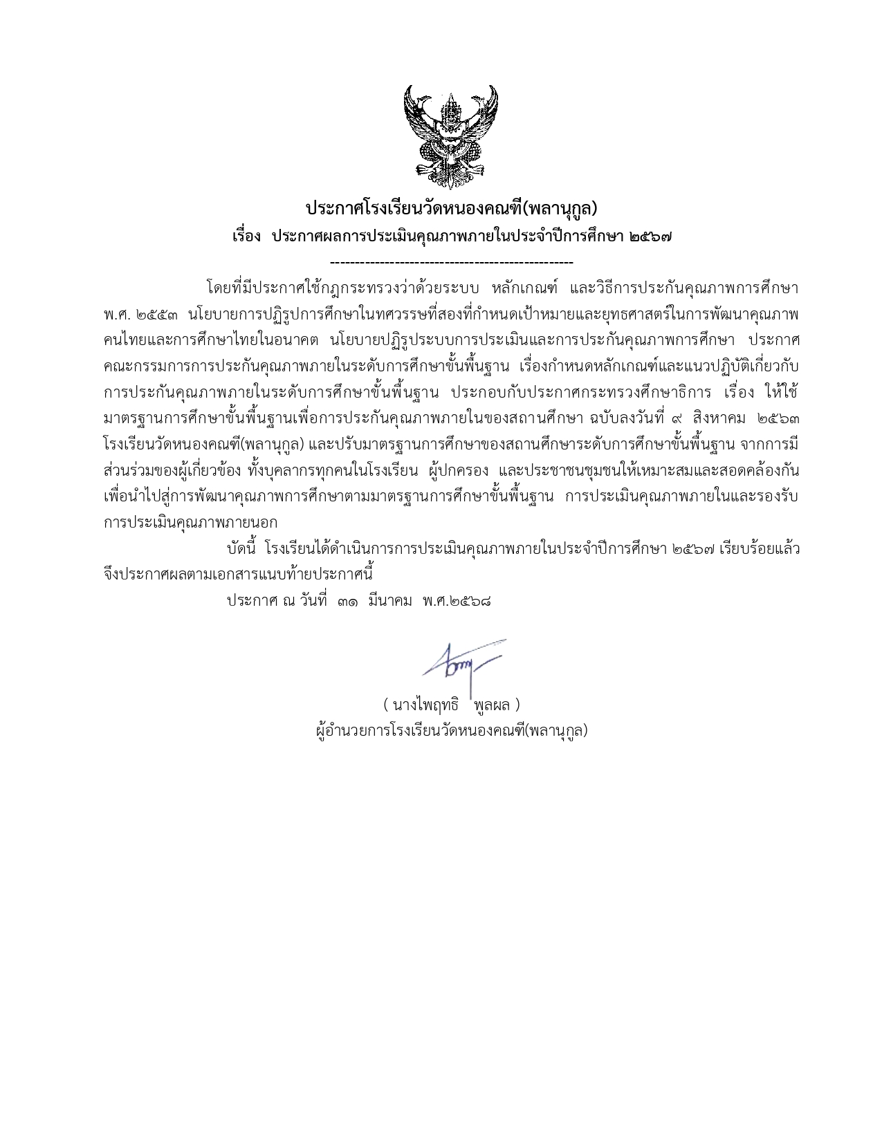 ประกาศโรงเรียนวัดหนองคณฑี(พลานุกูล) เรื่อง ประกาศผลการประเมินคุณภาพภายใน ประจำปีการศึกษา 2567 ระดับปฐมวัย และระดับการศึกษาขั้นพื้นฐาน ลงวันที่ 31 มีนาคม 2568