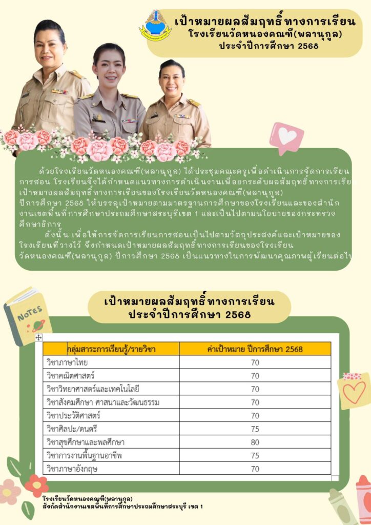 ประกาศโรงเรียนวัดหนองคณฑี(พลานุกูล) เรื่อง เป้าหมายผลสัมฤทธิ์ทางการเรียน โรงเรียนวัดหนองคณฑี(พลานุกูล) ประจำปีการศึกษา 2568