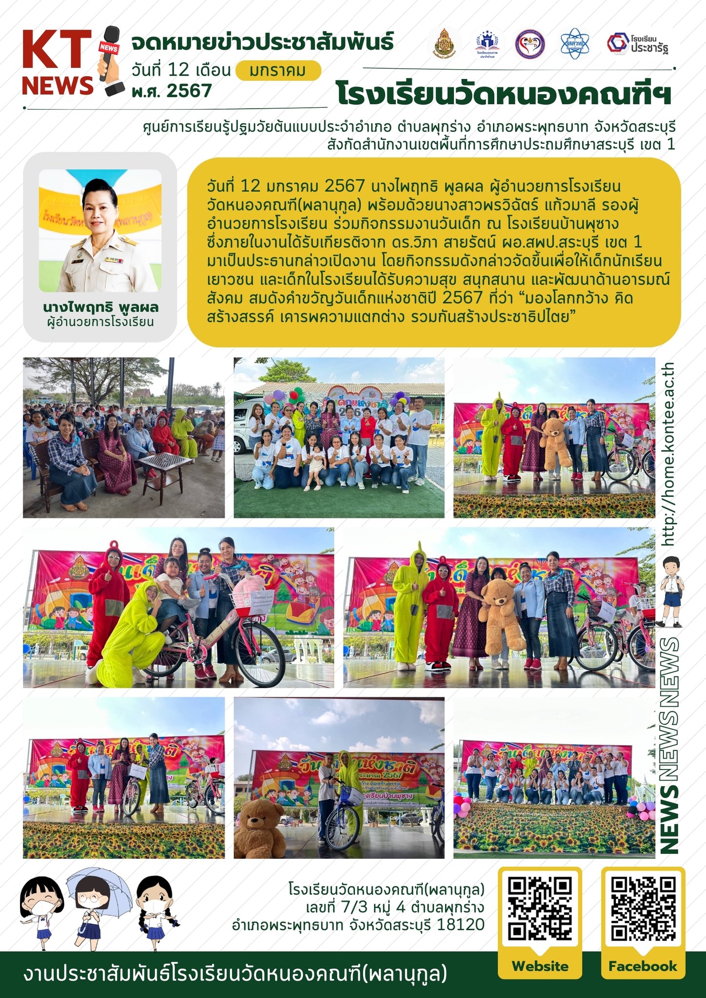 วันที่ 12 มกราคม 2567 นางไพฤทธิ พูลผล ผู้อำนวยการโรงเรียนวัดหนองคณฑี(พลานุกูล) พร้อมด้วยนางสาวพรวิฉัตร์ แก้วมาลี รองผู้อำนวยการโรงเรียน ร่วมกิจกรรมงานวันเด็ก ณ โรงเรียนบ้านพุซาง ซึ่งภายในงานได้รับเกียรติจาก ดร.วิภา สายรัตน์ ผอ.สพป.สระบุรี เขต 1 มาเป็นประธานกล่าวเปิดงาน โดยกิจกรรมดังกล่าวจัดขึ้นเพื่อให้เด็กนักเรียน เยาวชน และเด็กในโรงเรียนได้รับความสุข สนุกสนาน และพัฒนาด้านอารมณ์ สังคม สมดังคำขวัญวันเด็กแห่งชาติปี 2567 ที่ว่า “มองโลกกว้าง คิดสร้างสรรค์ เคารพความแตกต่าง รวมกันสร้างประชาธิปไตย” สำนักงานเขตพื้นที่การศึกษาประถมศึกษาสระบุรี เขต 1
