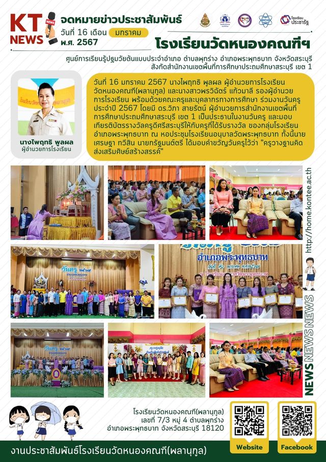 วันที่ 16 มกราคม 2567 นางไพฤทธิ พูลผล ผู้อำนวยการโรงเรียนวัดหนองคณฑี(พลานุกูล) และนางสาวพรวิฉัตร์ แก้วมาลี รองผู้อำนวยการโรงเรียน พร้อมด้วยคณะครูและบุคลากรทางการศึกษา ร่วมงานวันครูประจำปี 2567 โดยมี ดร.วิภา สายรัตน์ ผู้อำนวยการสำนักงานเขตพื้นที่การศึกษาประถมศึกษาสระบุรี เขต 1 เป็นประธานในงานวันครู และมอบเกียรติบัตรรางวัล “ครูดีศรีสระบุรี” ให้กับครูที่ได้รับรางวัล ของกลุ่มโรงเรียนอำเภอพระพุทธบาท ณ หอประชุมโรงเรียนอนุบาลวัดพระพุทธบาท ทั้งนี้นายเศรษฐา ทวีสิน นายกรัฐมนตรี ได้มอบคำขวัญวันครูไว้ว่า “ครูวางฐานคิด ส่งเสริมศิษย์สร้างสรรค์” #วันครู #โรงเรียนวัดหนองคณฑีฯ #ครูดีเด่น #ครูดีศรีสระบุรี