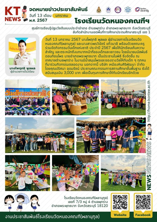 วันที่ 13 มกราคม 2567 นางไพฤทธิ พูลผล ผู้อำนวยการโรงเรียนวัดหนองคณฑี(พลานุกูล) และนางสาวพรวิฉัตร์ แก้วมาลี พร้อมด้วยคณะครู ร่วมจัดกิจกรรมวันเด็กแห่งชาติ ประจำปี 2567 เพื่อให้นักเรียนเห็นความสำคัญ และตระหนักถึงบทบาทหน้าที่ของเด็กและเยาวชน โดยมีนายมนัสพันธ์ ดอนก้อนไพร นายอำเภอพระพุทธบาท เป็นประธานในพิธี ซึ่งจัดขึ้น ณ เทศบาลตำบลพุกร่าง ในงานมีน้ำสมุนไพรและของรางวัลให้กับเด็ก ๆ ทุกคนที่มาร่วมกิจกรรมตลอดงาน นอกจากนี้ บริษัท เหมืองหินศิริพัฒนา จำกัด โดยคุณปริศนา อุดมรัตน์ ประธานคณะกรรมการสถานศึกษาขั้นพื้นฐาน ยังได้สนับสนุนเงิน 3,000 บาท เพื่อเป็นทุนการศึกษาให้กับนักเรียนโรงเรียนวัดหนองคณฑี(พลานุกูล) อีกด้วย